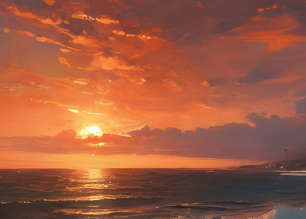 A painting of a stunning sunset at the beach, where the sky and sea are painted with vibrant hues and waves crash onto the shore