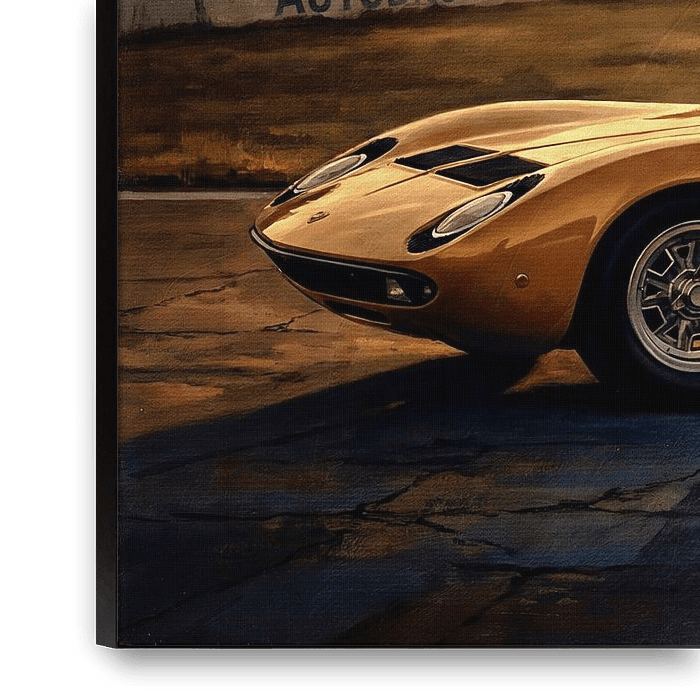 Buy this painting Golden Lamborghini Miura Sunset Painting by Jan Keteleer as a reproduction on canvas, ArtFrame, poster and wallpaper, printed on demand in high quality.