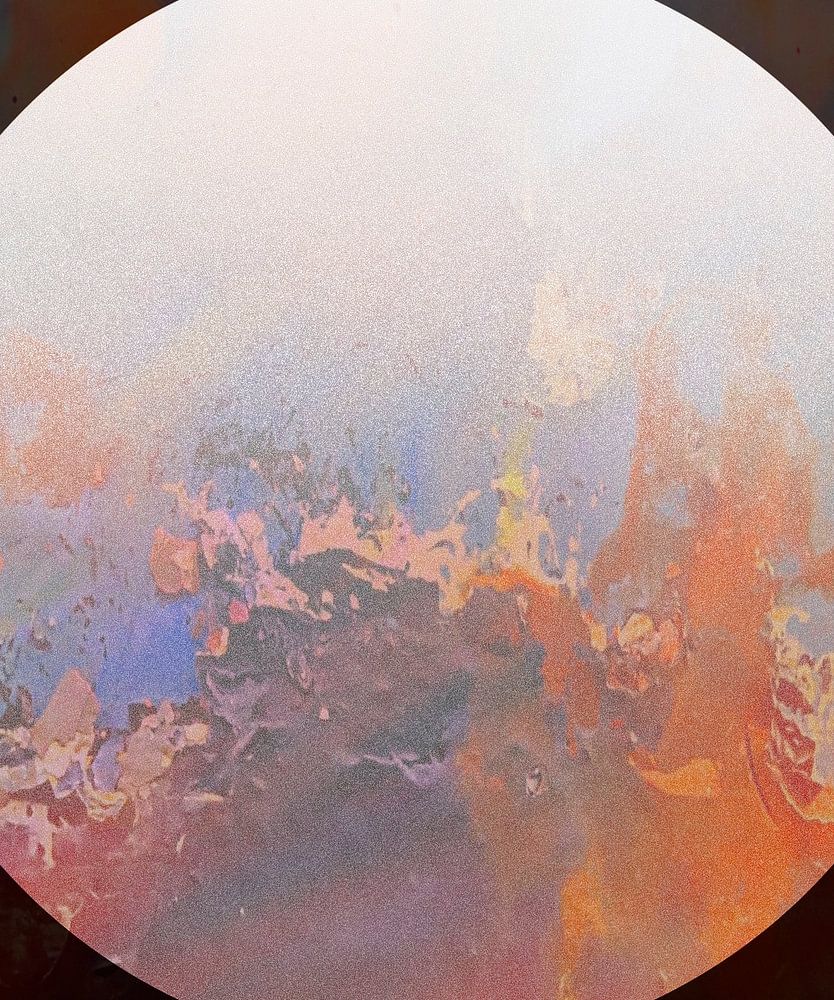 An abstract but minimal painting of a mother-of-pearl golden glowing moon in warm monochromatic colours such as warm brown, beige, cream, gold, copper, bronze, ivory, black, dark blue and others.