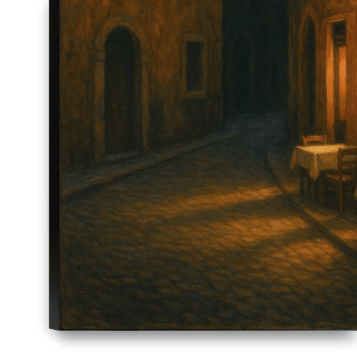 Golden Rome Realism captures the quiet allure of a Roman side street just as dusk begins to settle. The worn ochre walls shimmer under the golden afterglow of sunset, while the soft light of a trattoria spills warmly into the cobblestone lane. Empty tables wait patiently for the night to begin — a moment poised between solitude and the…