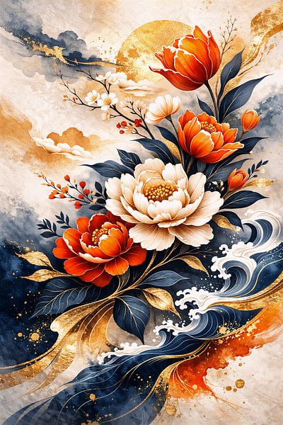 A dynamic floral artwork inspired by Japanese aesthetics, featuring expressive peonies in vibrant orange and soft cream tones. Flowing navy brush strokes and shimmering gold accents create movement and depth, giving this piece a bold yet harmonious character. The composition feels both modern and timeless, perfect for statement walls in…