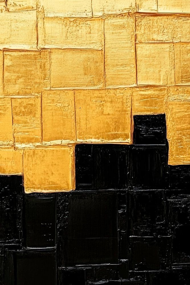 A fascinating interplay of golden and dark boxes unfolds, creating a sense of depth and structure. The harmonious combination of shiny gold and deep black adds elegance and modernity to any room. It ideally complements a stylish living room or an inspiring office, where it radiates creativity and luxury.