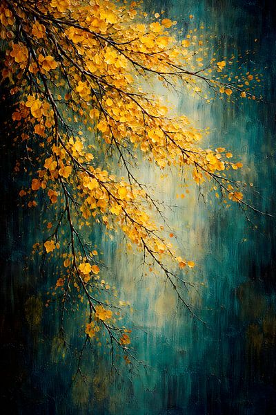This captivating artwork immerses the viewer in a scene of tranquil beauty. Lush, golden leaves cling to delicate branches that hang gracefully from above. The background is a symphony of deep turquoise and blue tones that blend seamlessly, reminiscent of a gentle autumn rain or the shimmering light through a forest. The texture of the…