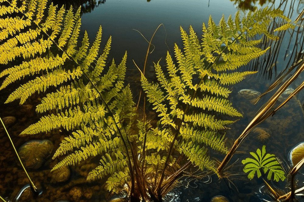 Auf der rechten Seite neigen sich trockene, goldene Gräser zum Wasser hin, wobei ihre verdorrten Halme einen Kontrast zum lebendigen Grün der kleineren Farne in der Nähe bilden. Diese Begleitpflanzen mit ihren gebündelten Blättchen tragen zum vielschichtigen Zusammenspiel der Texturen bei – federartige Wedel, drahtige Grashalme, glatte Kieselsteine und wellige Reflexionen verschmelzen zu einer harmonischen Komposition. Das von oben einfallende Licht taucht die Szene in einen warmen Schein, hebt Details hervor und wirft gleichzeitig weiche Schatten, die das Gefühl von Tiefe und Ruhe verstärken.