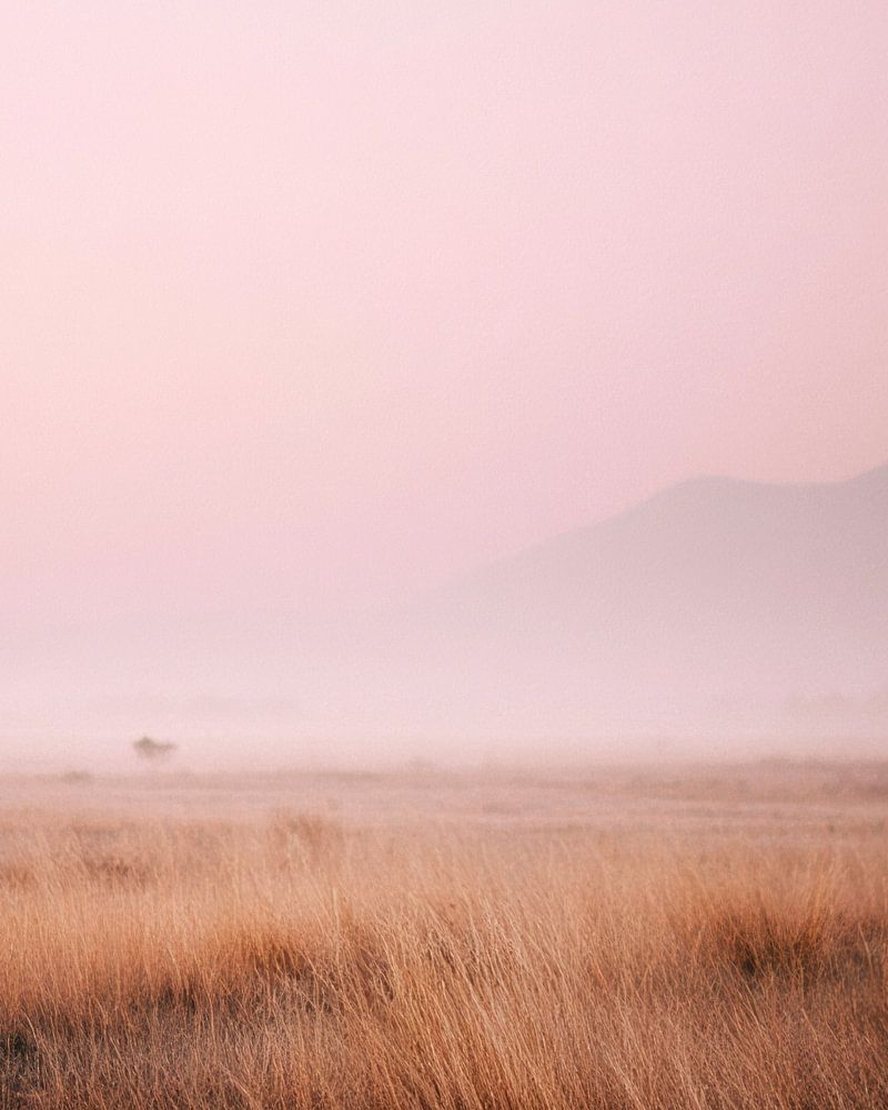 This photo shows a composition of tall, dry grass stalks in the foreground, with a soft misty background. The light is warm and comes from diagonally behind, illuminating the stalks and leaving the surroundings shrouded in mist. The silhouettes of trees fade into nothingness.