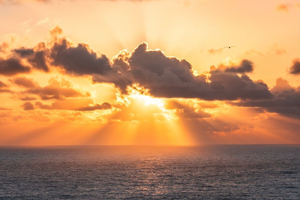 At the bottom of the image, you can see the vast ocean, calm and serene, bathed in the soft light of the setting sun. The contrasts between the cool blue of the sea and the warm golden hues of the sun create a stunning visual effect that is both soothing and powerful.
