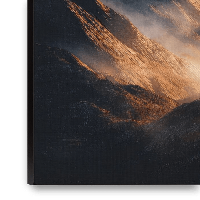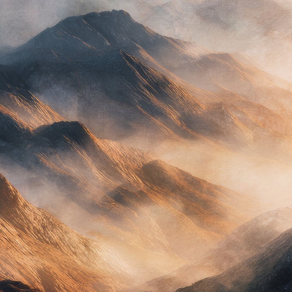 This mountain landscape unfolds in soft layers of stone, light and mist. The ridges catch a warm, golden light that slowly seeps through the mist, softening the rough shapes. Shadows recede into the depths, while higher peaks dissolve into a light haze. The image feels quiet and spacious, as if the mountains only half let themselves be…