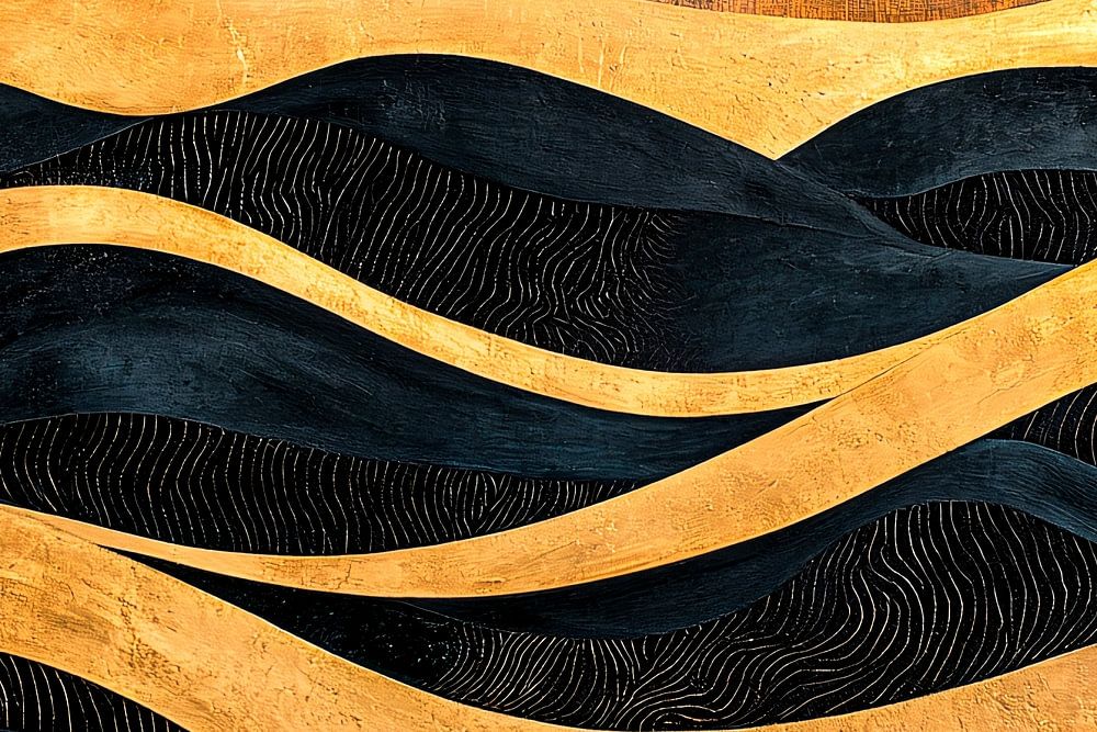 This stunning wall design captures the essence of a serene desert landscape. The undulating lines in gold and black suggest sand dunes bathed in a warm glow, while the silhouettes of camels add a touch of adventure. The design exudes luxury and elegance thanks to its contrasting colour palette and fine details. Ideal for modern interiors, it creates a soothing atmosphere and gives any room a sophisticated look. Be enchanted by the combination of minimalism and artistic flair.