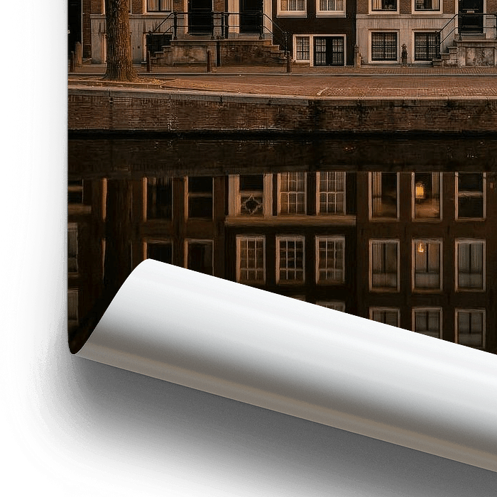 A row of characteristic canal-side houses stands majestically along the water, bathed in warm evening light. The façades, each with their own unique shape and details, tell tales of a rich history. The soft glow of the setting sun gives the bricks a golden hue, whilst the sky slowly shifts into tranquil pastel colours.