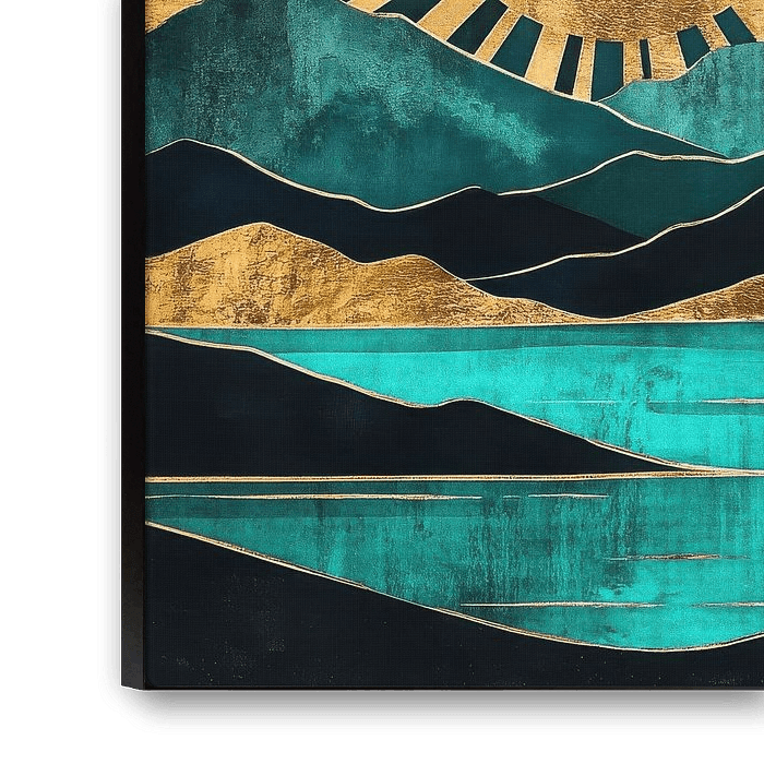 This simple and elegant vector artwork features a golden sun with rays, a turquoise sea and black mountains in the background. The gold leaf painting uses a turquoise and green colour palette in a flat, high contrast design with ultra-detailed, modern and contemporary art styles.