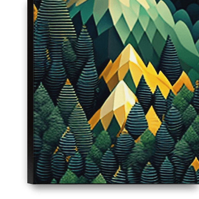 This painting depicts a stylised mountain landscape with sharp-edged peaks in vibrant shades of green and yellow, complemented by lush, abstract forests. The geometric shapes create a multi-layered and dynamic image, while the golden sunlight enhances the play of light and shadow on the terrain. The composition is a harmonious blend of…