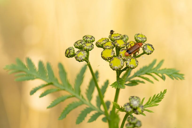 In a sea of soft gold, a reddish-brown insect rests on tansy. The small red shield bug sits still, but an intruder appears.