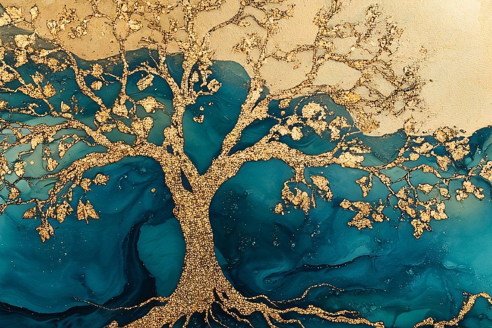 This beautiful design combines the flowing lines of a golden tree with a background of deep turquoise and blue-green hues. The tree appears to grow from the layers of earth, with its roots firmly anchored in the soil, while its branches reach for the sky. The subtle gold accents add a touch of luxury and sophistication, making it perfect for modern interiors. The vibrant colours and dynamic design exude energy and tranquillity, making this artwork an eye-catcher in any space. Ideal for an office or bedroom, where it can bring a sense of connection and harmony.