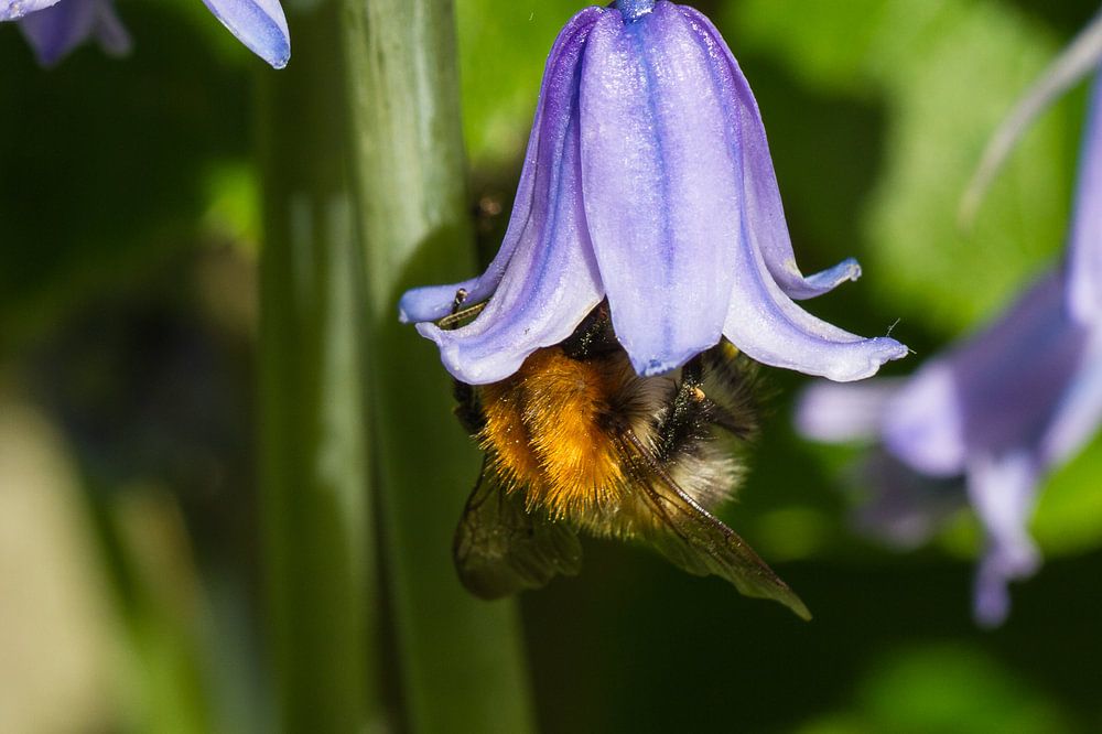 Picture of "bee" in the flower, looking for food. the purple flowers are in nice contrast with the "bee".