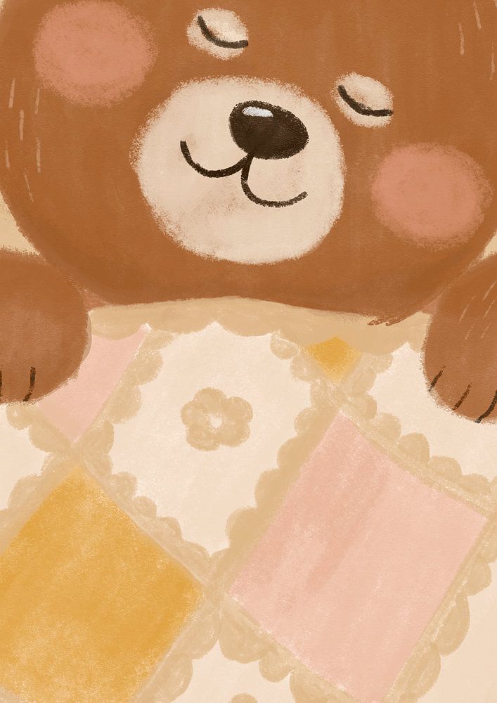 An adorable illustration of a bear asleep under a soft blanket. The little bear radiates calm and cosiness, perfect for a children's room. The soft, pastel colours create a calm and peaceful atmosphere, ideal for creating a warm and inviting environment. This cute and dreamy image brings a touch of love and comfort to your little one's bedroom, and is a great choice for parents looking for a cosy and enchanting decoration for their child's room.