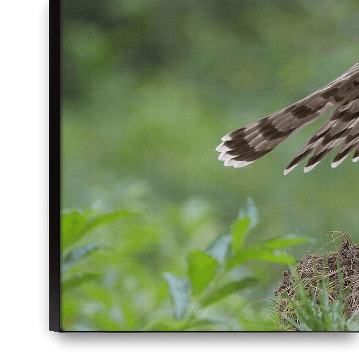 Young female Northern Goshawk with her wings spread between the high grass on a clearing in a forest with the soft green colors of vegetation in the background.