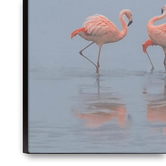 Buy the photo Graceful flamingos step through the water by Jolanda Stam on canvas, ArtFrame, poster and wallpaper, printed on demand in high quality.