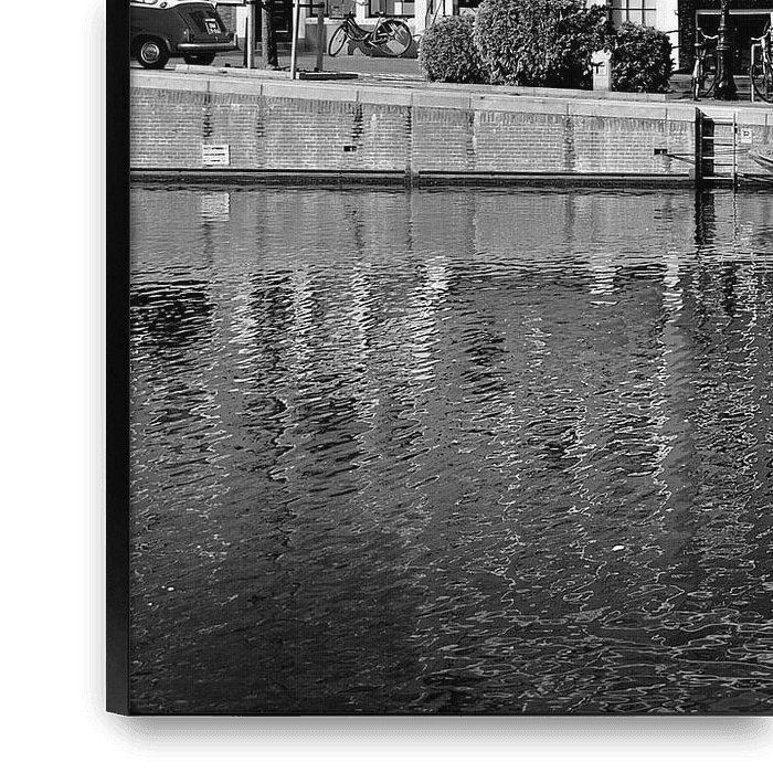 Vintage black-and-white photo of the canal houses on Amsterdam's canals. Good to see are the vintage cars parked and the characteristic facades of the buildings.