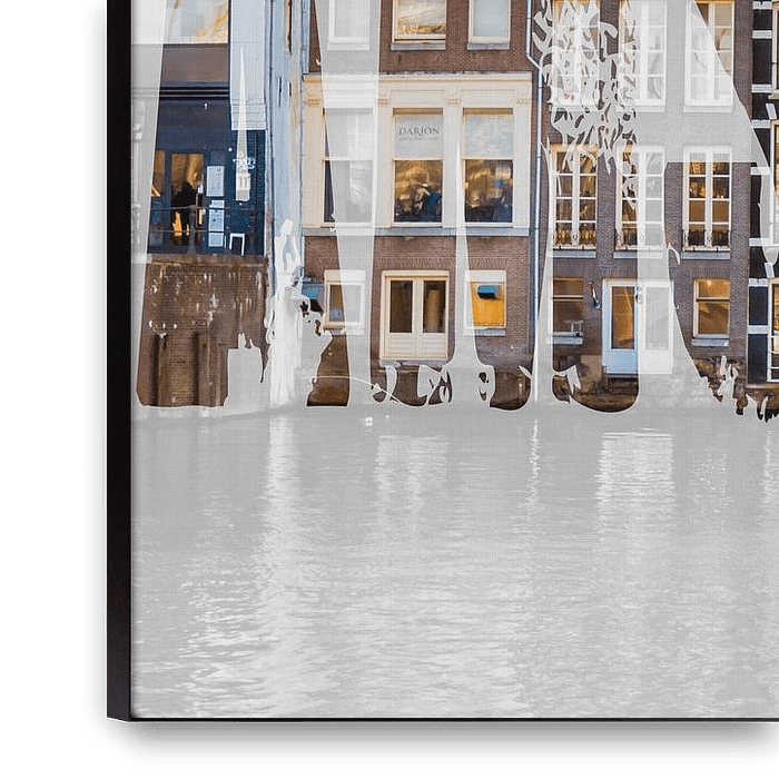 Grachtenpanden in het centrum van Amsterdam, kort bij het Centraal Station. De achtergrond en de letters lopen in elkaar over waardoor het een prachtig plaatje blijft voor aan de muur.