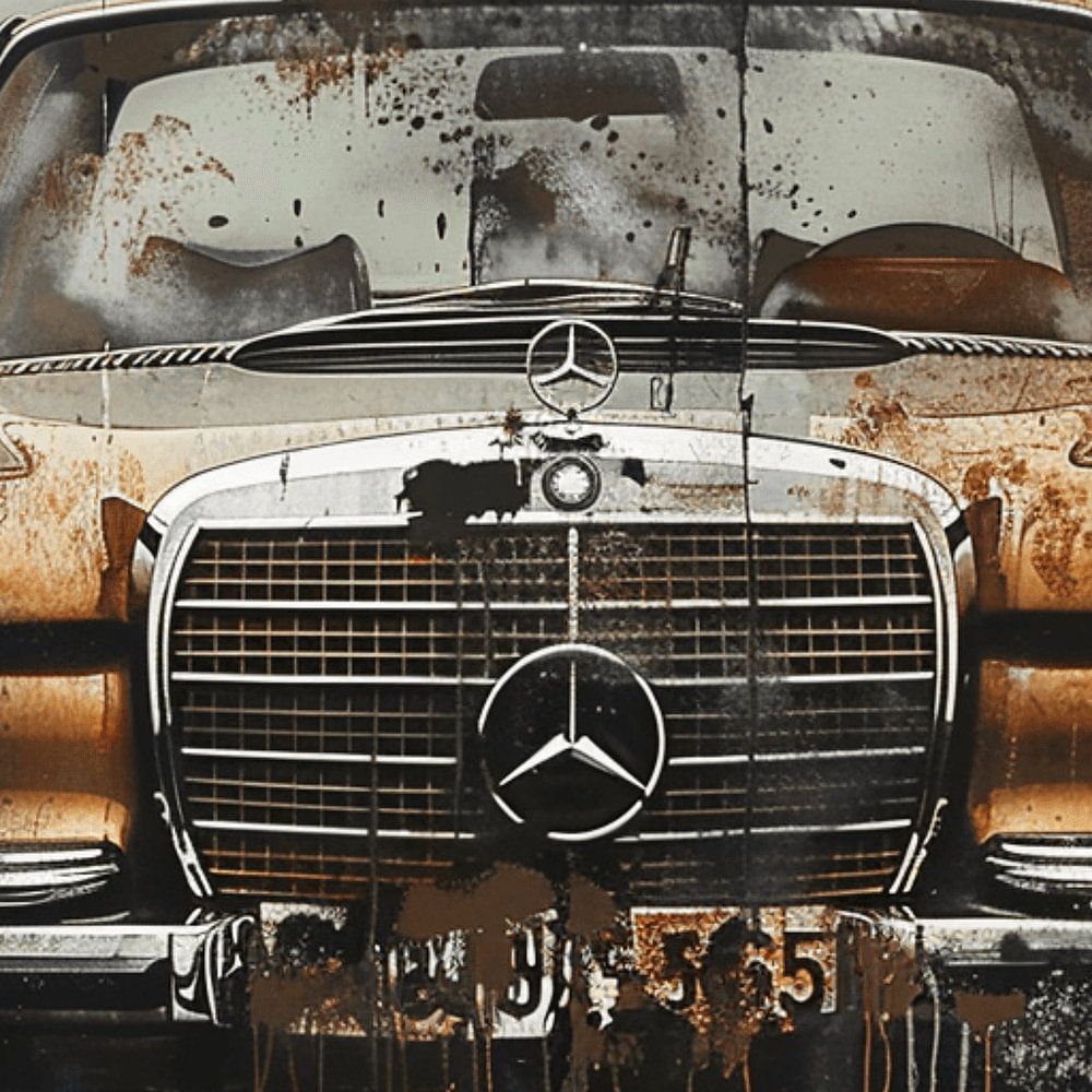 A classic Mercedes-Benz, marked by the patina of time, dominates the image against an urban backdrop of colour splashes and textured surfaces. The front view of the car captures the striking radiator grille design and the round headlights, which are surrounded by an aura of vintage. Rust-coloured accents blend with shades of grey and black, creating a dynamic tension between the elegant automotive design and the raw aesthetic of decay. The artwork captures the beauty of age and the traces of history.