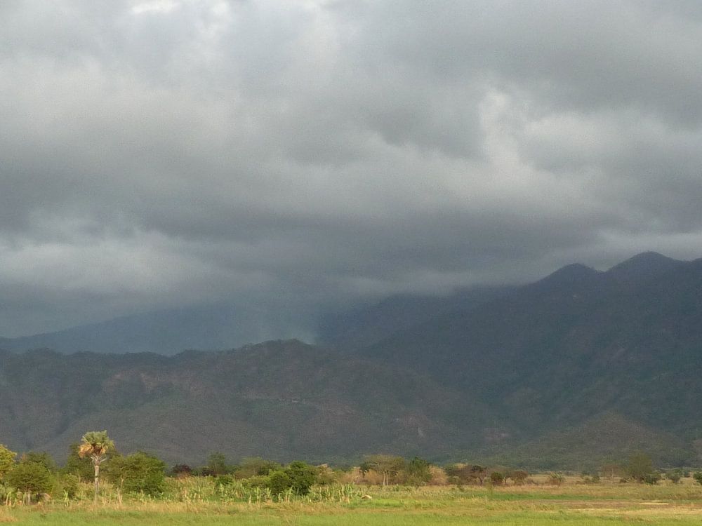 Een groen graslandschap met bergen en wolkenlucht in Tanzania, Afrika.