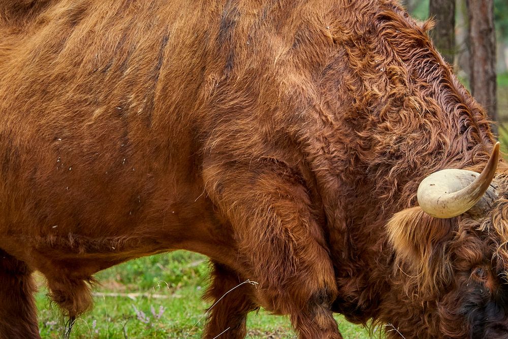 The Scottish Highlander is a mostly red-brown breed of cattle that originates from Scotland. They have long hair and long horns.
