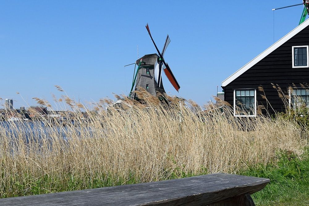 We were lucky with the weather and it turned out to be a great day for a windmill walk at Zaanse Schans in The Netherlands. Rested for a while on this bench to admire the windmills around us.
