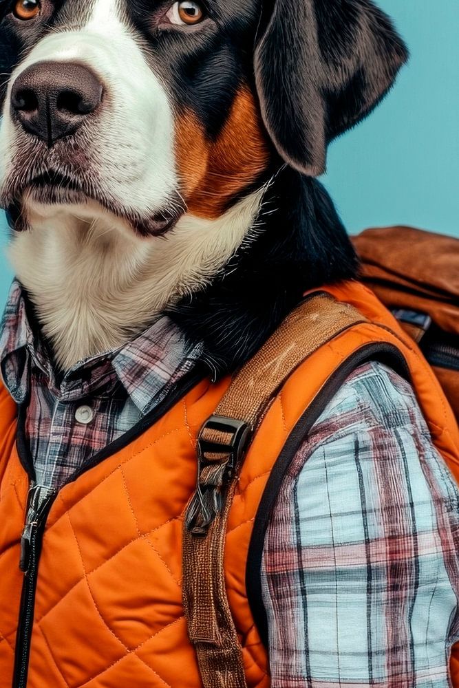 Proud and upright, this Greater Swiss Mountain Dog presents himself in a fashionable orange-coloured waistcoat and a structured rucksack, as if ready for an adventure. His loyal gaze radiates both intelligence and friendliness, while the typical black and white colouring of his coat provides a charming contrast to his modern clothing.