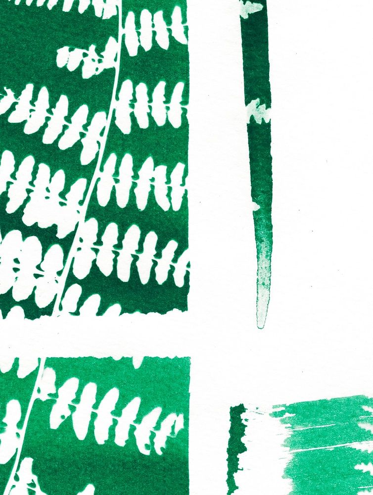 Green abstract minimalist work of painted surfaces and dried leaves of ferns.
