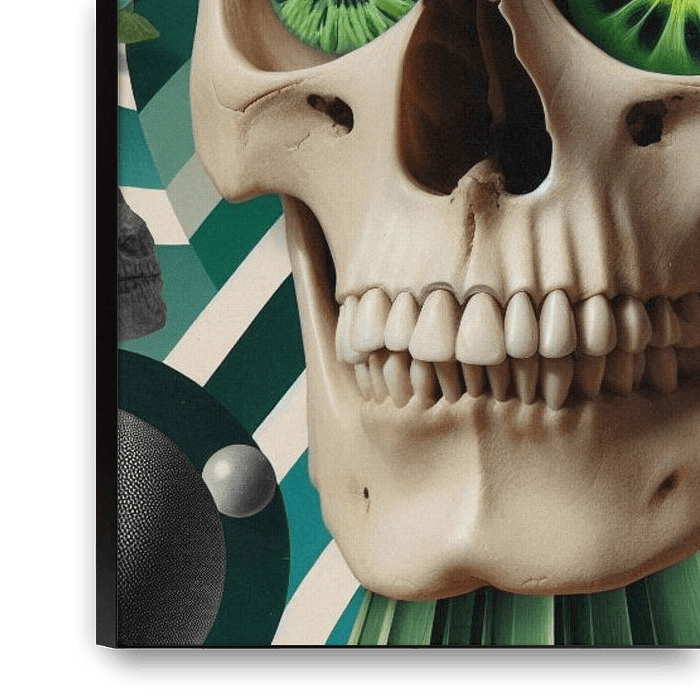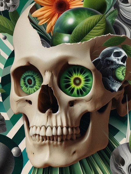 A surreal skull composition infused with vibrant green leaves and organic textures. The artwork explores the coexistence of life and decay, transforming skeletal imagery into a symbol of renewal. Rich colors and layered botanical details create a fresh contemporary atmosphere.