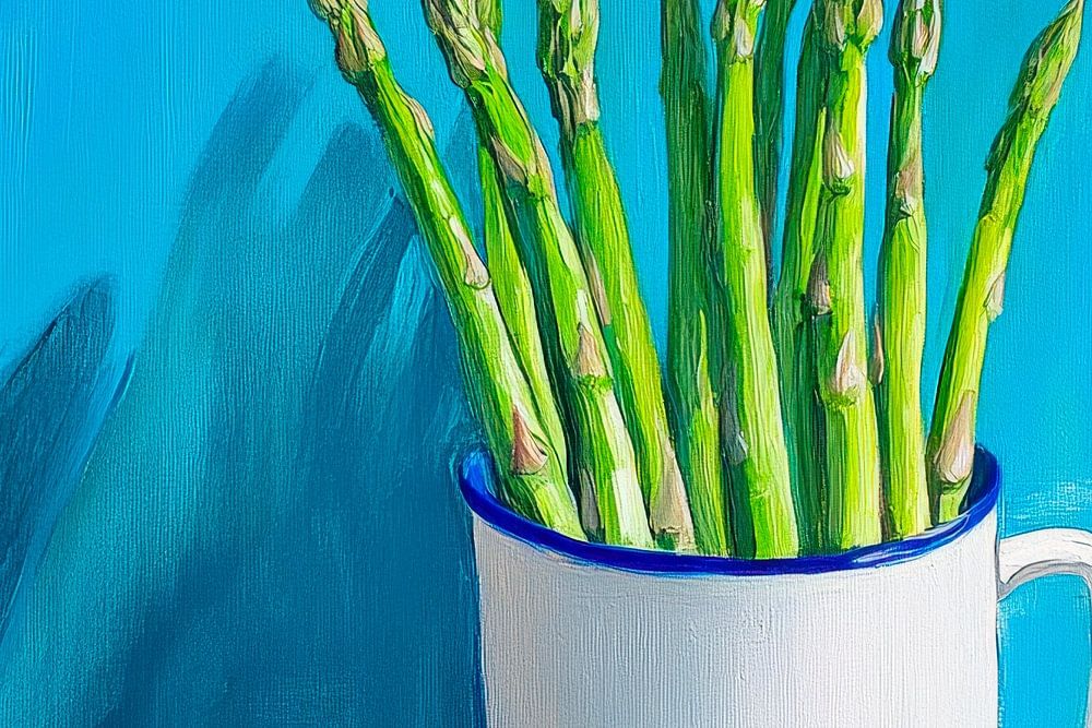 In vivid contrast to the bright blue backdrop, fresh asparagus spears sprout from a nostalgic cup. Their crisp texture and vibrant colour add a fresh touch to any kitchen that will whet the appetite. This work of art brings the flavour of spring and the feeling of freshness straight into your home!