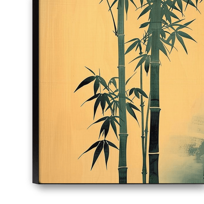 A bamboo forest with tall, slender trunks and delicate leaves gently reaching in different directions. The background progresses from a pale yellow warm hue to a deeper, cooler teal. The subtle brush textures and shadows give the image an organic and timeless feel. The composition exudes balance and harmony, perfect for a room that needs a natural and serene atmosphere.