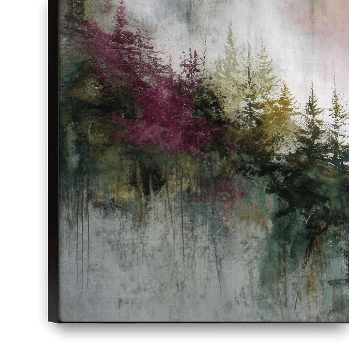 An expressive abstract forest landscape in green, pink, purple and misty grey exudes a dreamy atmosphere. A timeless abstract scene that evokes imagination and adds a poetic, calming energy to the space.