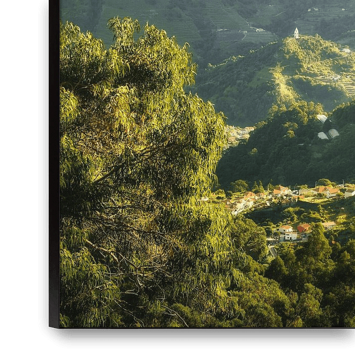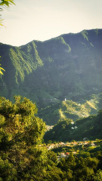 This photo shows Madeira's lush, green nature, with ferns, tropical trees and rippling waterfalls. The image captures the magic of the jungle, where sunbeams fall through the canopy and tiny droplets of water sparkle in the light. Small details like the meandering streams, moss-covered rocks and the play of shadows between the leaves…