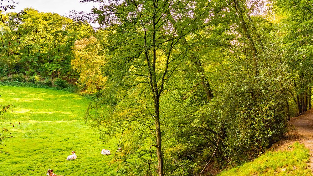 autumn landscape with cow pasture, forest and hiking trail