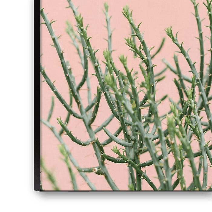 Buy this landscape artwork Green plant against coral pink wall | Botanical picture by Mirjam Broekhof on canvas, ArtFrame, poster and wallpaper, printed on demand in high quality.