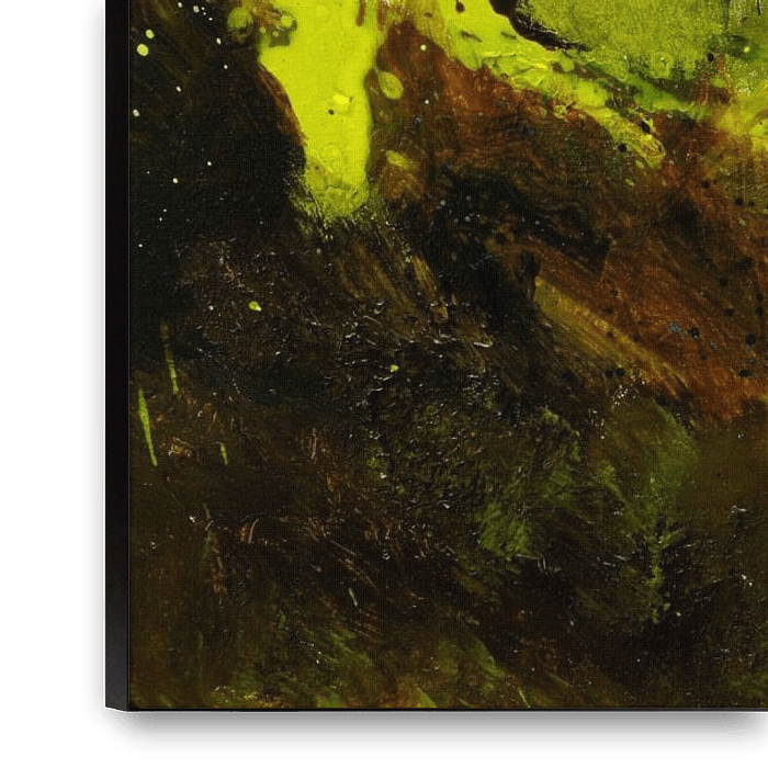Green waveVivid colours in yellow, green, and blue are mixed with black splatters to create an abstract visual effect. Dots and drips of paint add dynamic and texture to the composition, evoking energy and movement.