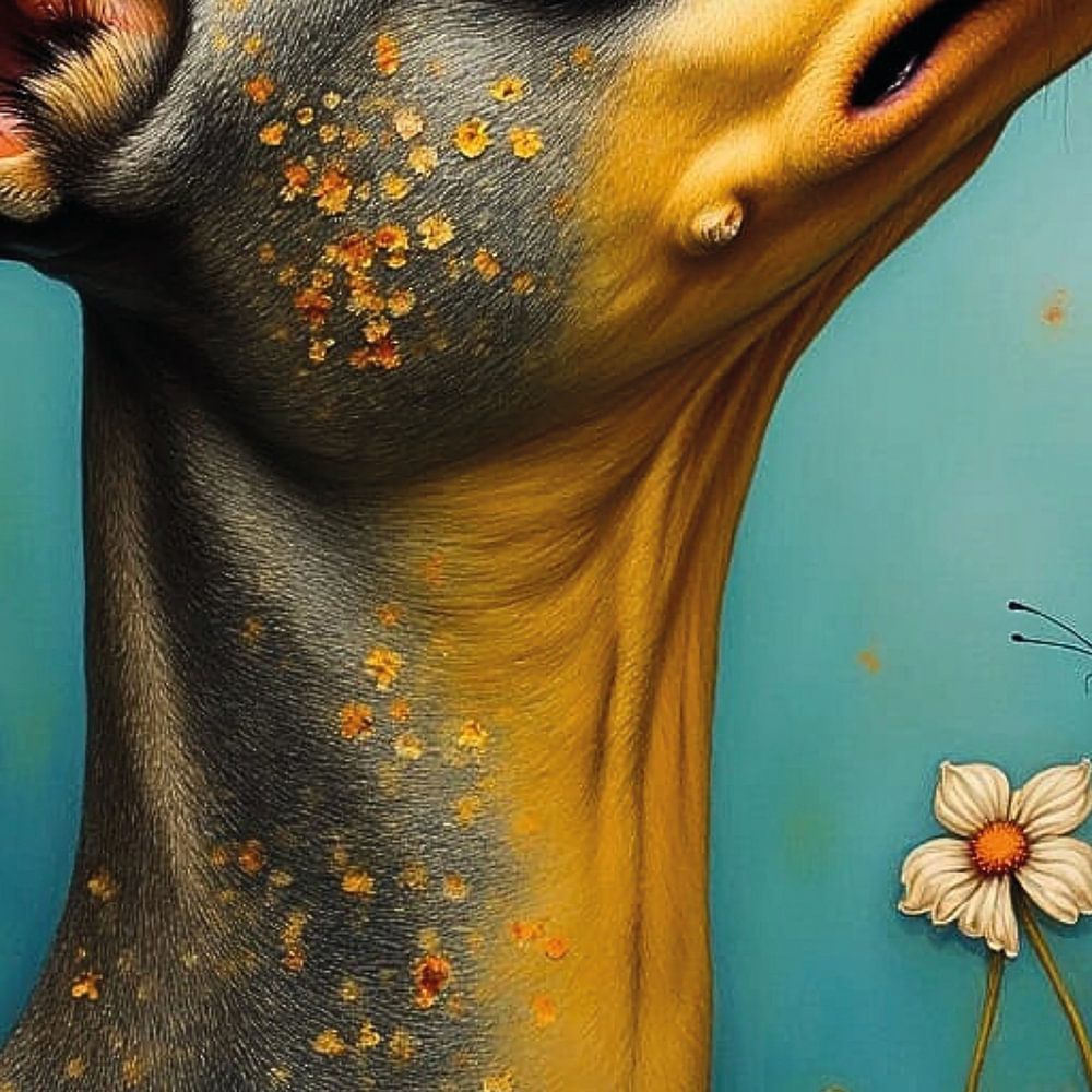 This enchanting artwork shows an elegant greyhound in a surreal flower meadow, surrounded by butterflies, white daisies and golden plants. The dog looks up dreamily, while its fur is subtly decorated with golden dots - a playful nod to magic and wonder. The background in soft teal enhances the tranquillity and contrast of this poetic…