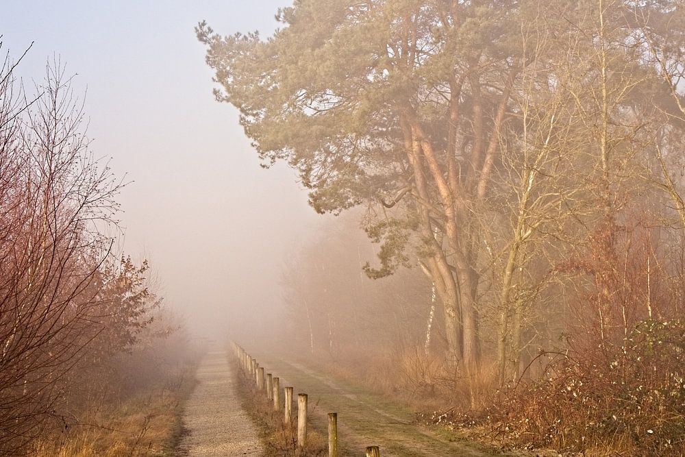 Mystical conditions at sunrise on this winter morning with frost and fog in National Park de Groote Peel in Ospeldijk.