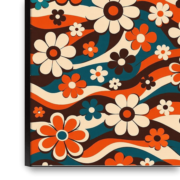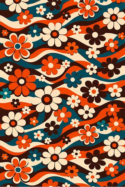 A vibrant 70s-inspired floral pattern featuring flowing wave lines and bold retro blooms in terracotta, teal, cream, and chocolate tones. This groovy statement artwork brings mid-century nostalgia and playful energy to modern interiors.