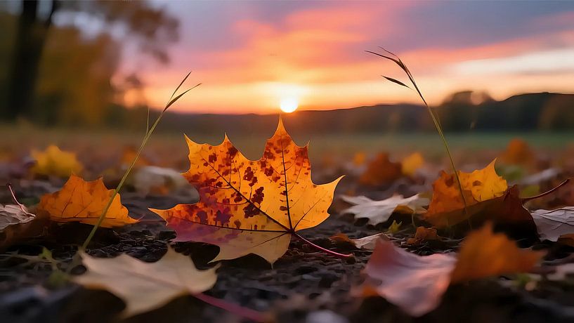The camera stands close to the ground and captures a carpet field of autumnal leaves in high-resolution macro perspective: close, highly structured close-ups of maple, oak and birch leaves are superimposed in a mosaic of colours. Rust red, mustard yellow, copper brown and faded orange alternate with deep green tones and fine, still damp…