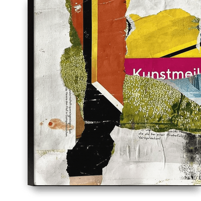 The use of advertising poster remnants and Gelli print pieces creates extraordinary works that speak a unique visual language.