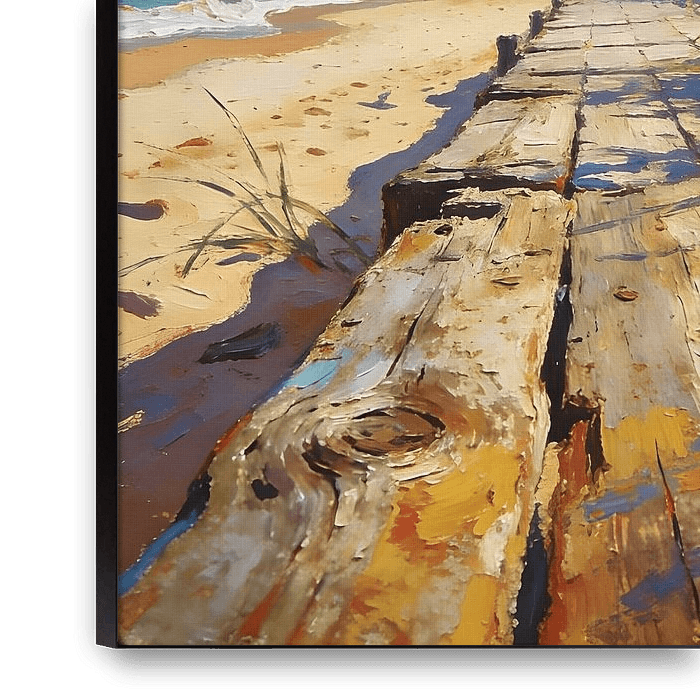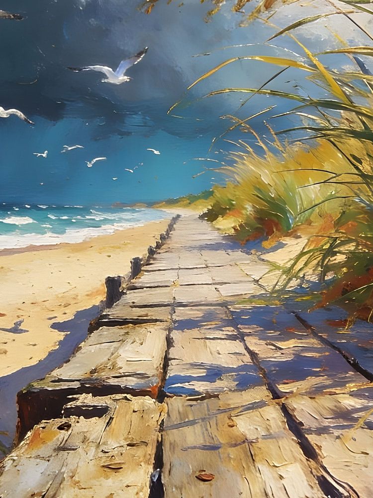 Gulls Over a Quiet Shore reflects the lightness and openness of a peaceful summer day at the coast. The painting presents a calm shoreline scene with sea oats grass, a wooden boardwalk, and seagulls drifting through a clear blue sky. The vertical composition draws the eye upward, emphasizing space, air, and the feeling of freedom found…