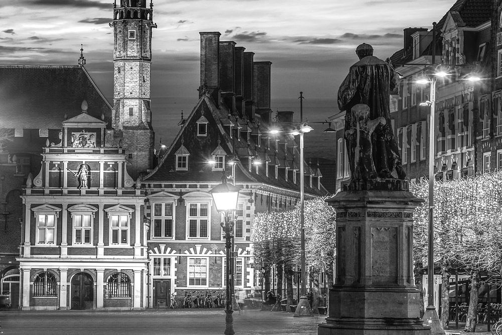 The old centre of Haarlem with in the middle the town hall of this beautiful city. The evening has fallen and the lights are turned on.