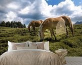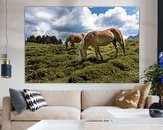 Buy this landscape artwork Haflinger horses on the Alpe di Siusi by Martina Weidner on canvas, ArtFrame, poster and wallpaper, printed on demand in high quality.