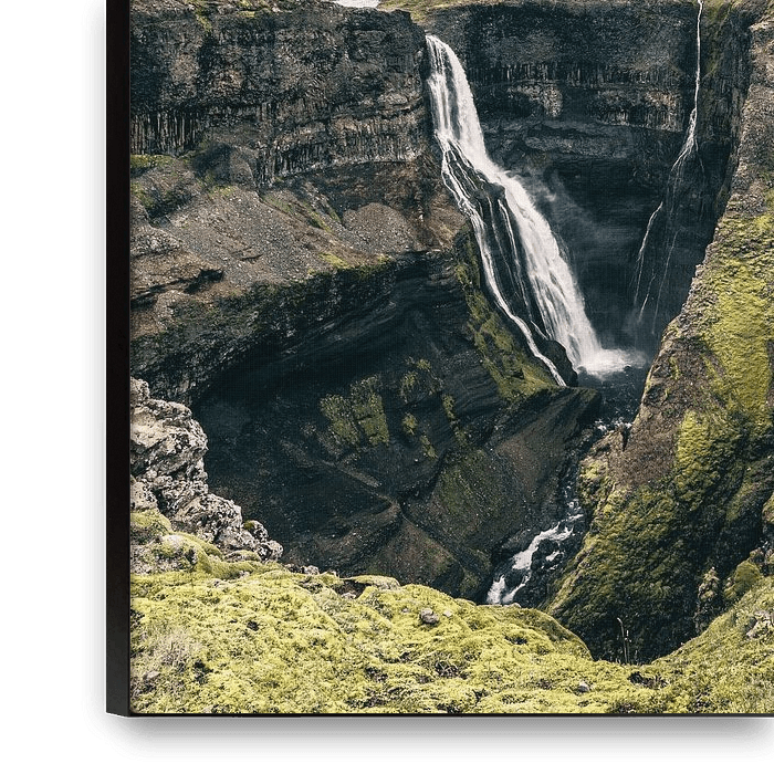 View on the Háifoss waterfall from high up the mountain ridge over the Fossa river in Iceland during a stormy day in summer. The water of the Fossa river falls deep into a canyon with smaller waterfalls around.