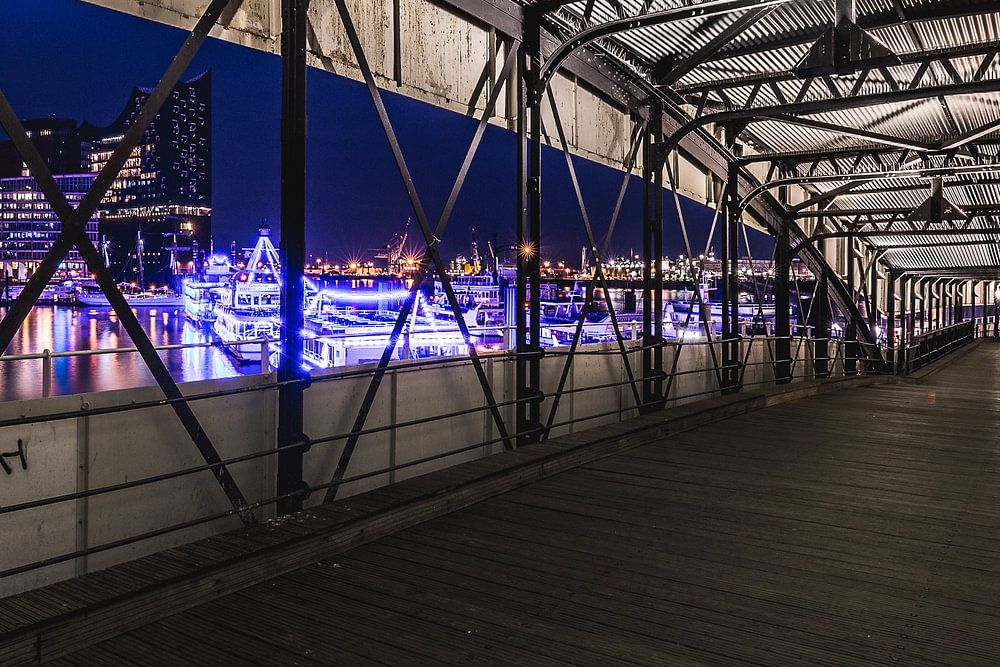 Blick von der Brücke zum Anleger der Cap San Diego über den Hamburger Hafen bei Nacht. Im Hintergrund die Elbphilharmonie