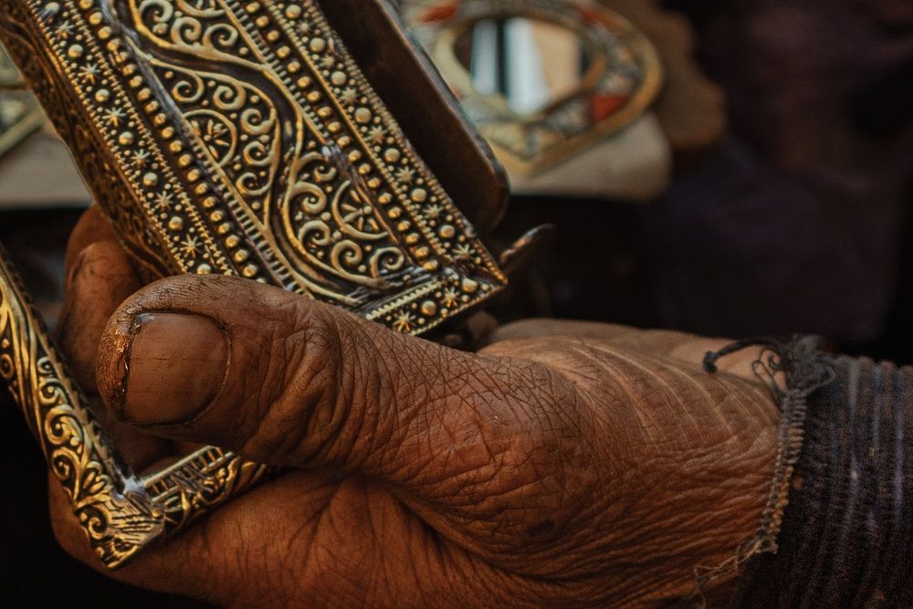In a weathered hand rests a piece of pure craftsmanship - a handmade lock, richly decorated with ornate patterns and minute details. The roughness of the hand contrasts with the refinement of the metal, a reflection of the dedication and precision required to bring such an object to life. In the background, other artisan creations fade away as light gently glides across the engraved surface, emphasising the depth and character of the piece.