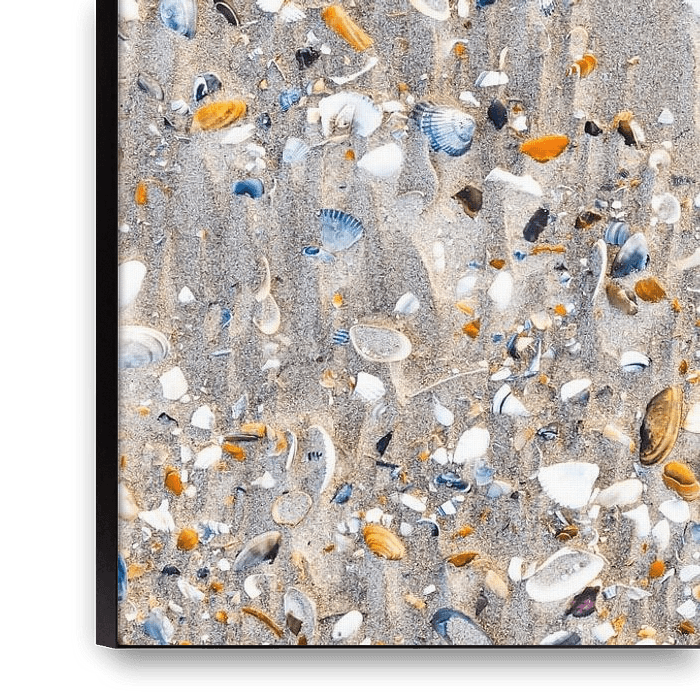 A tranquil beach scene in which a handprint remains visible in the soft sand, surrounded by colourful shells. The combination of natural tones, fine textures and subtle orange and blue accents gives this image a fresh, calming feel.