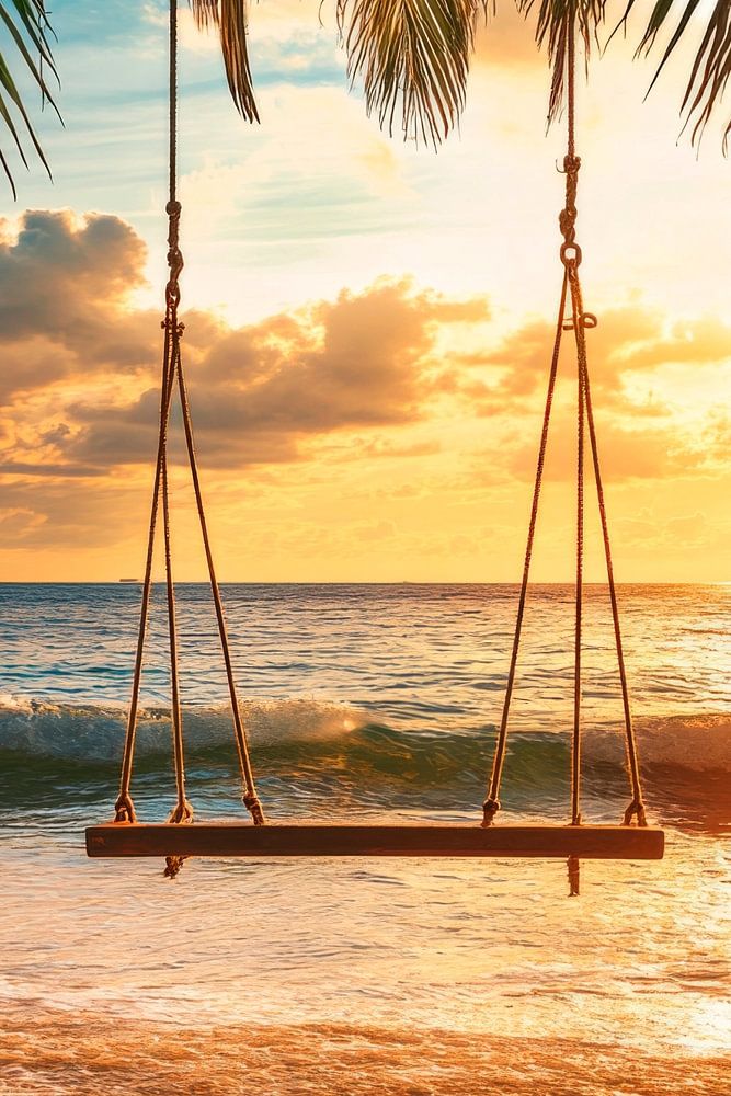 A gentle breeze blows through the palm trees as the sun sinks over the horizon in a radiant golden colour. A wooden swing swings invitingly over the glistening water, its gentle lapping spreading an atmosphere of peace and happiness. Footprints in the warm sand tell of carefree moments that make the day unforgettable.